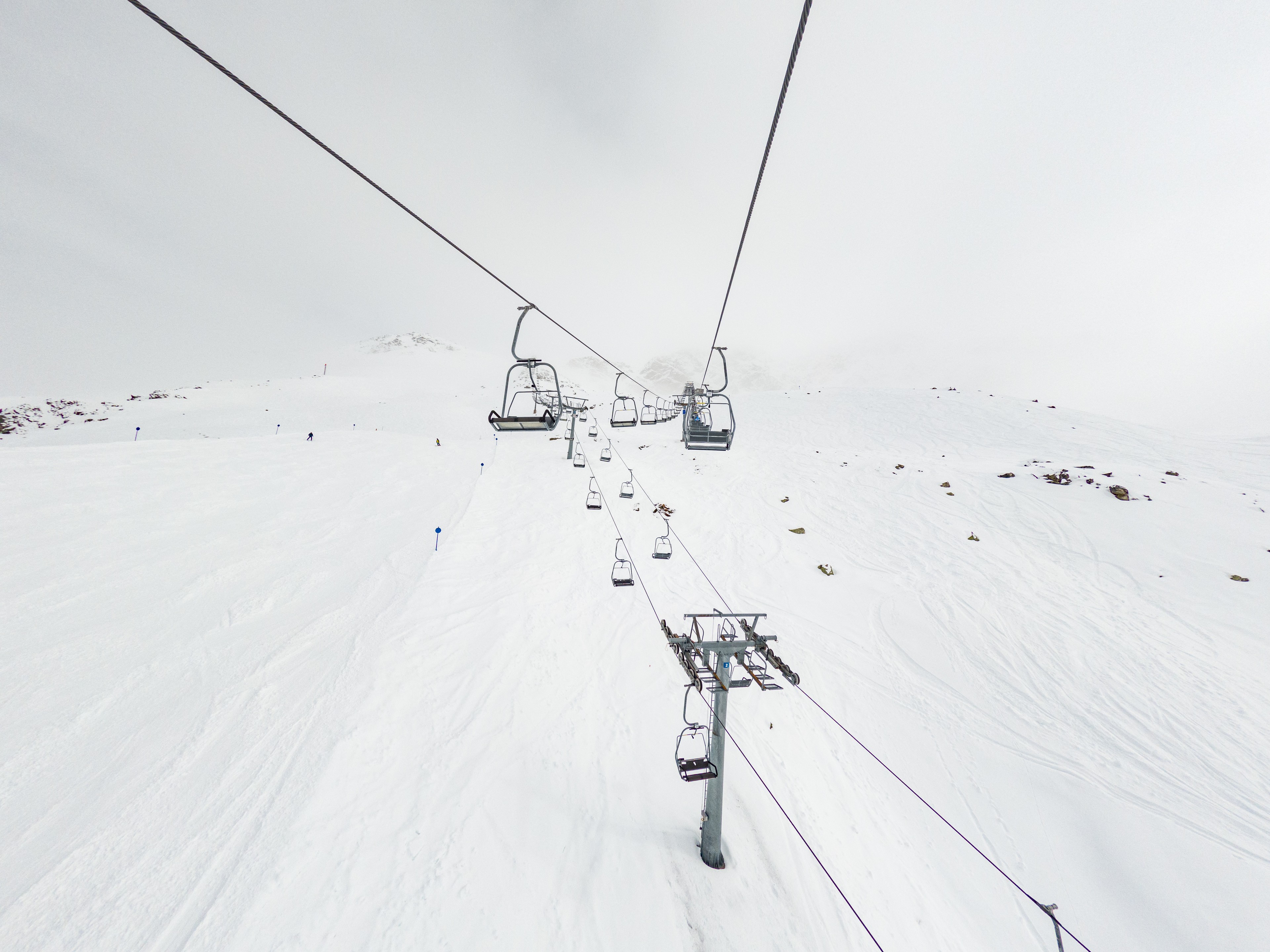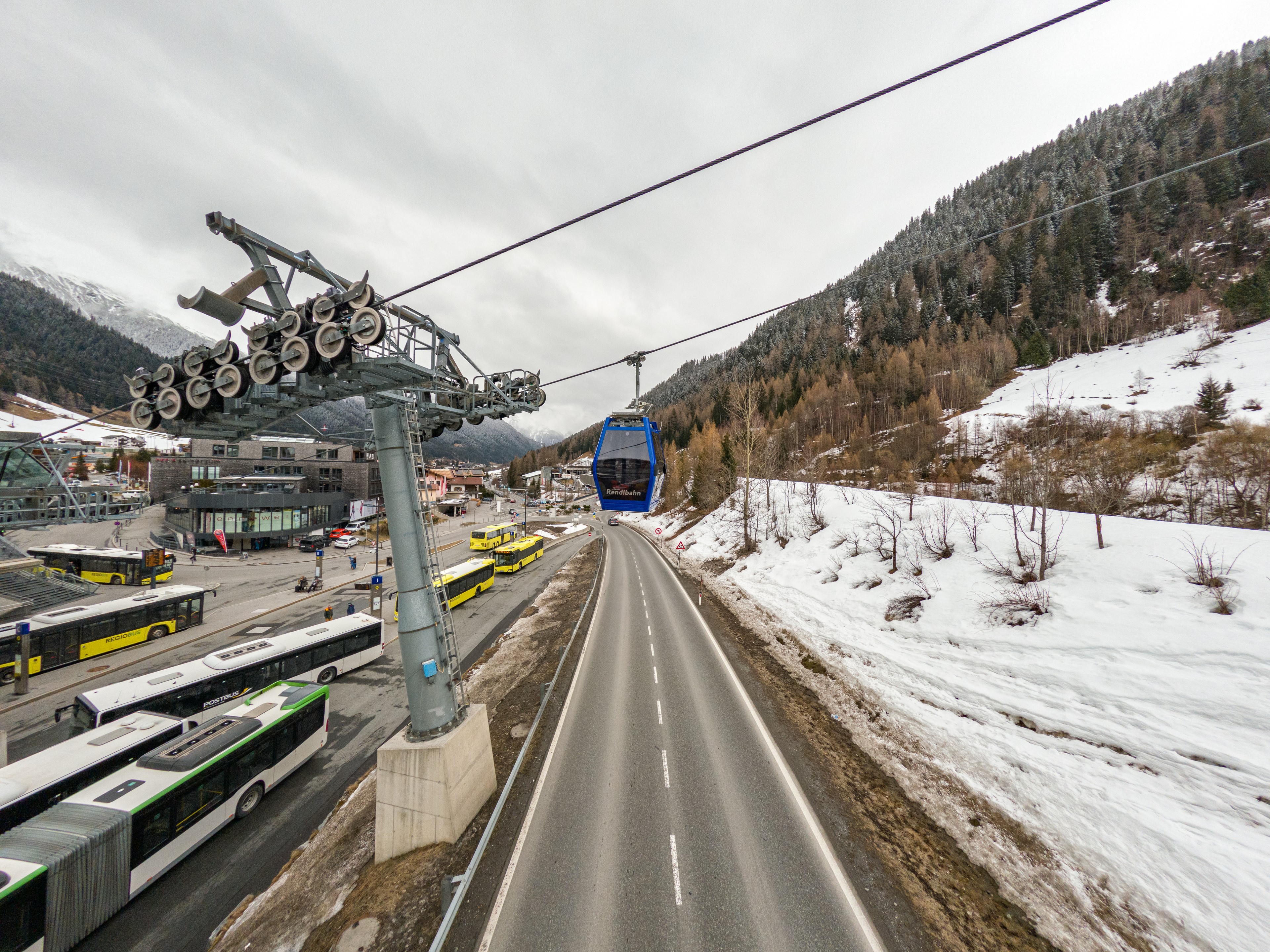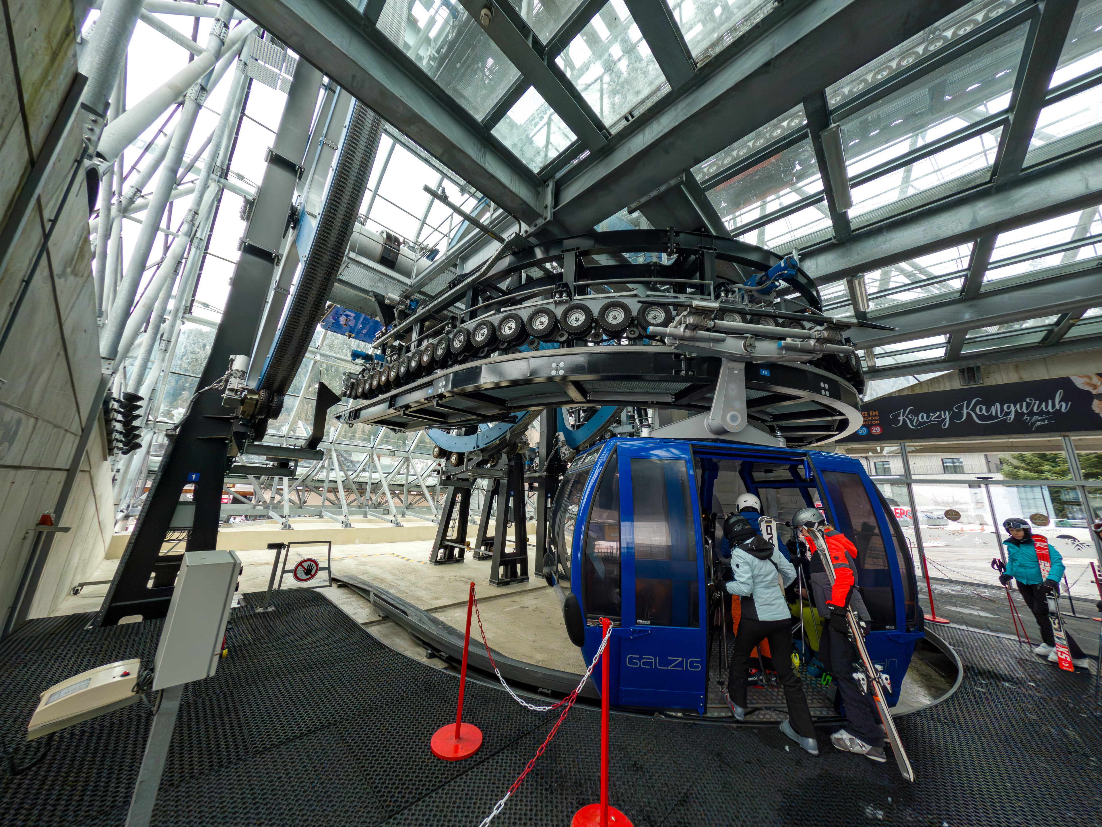 Unikalna dwupoziomowa stacja funitelu Galzigbahn (St. Anton), gdzie wyprzęgane kabiny zjeżdżają na stację po pionowo ustawionych kołach.